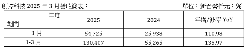 創(chuàng)控科技3月營收5,473萬元 年增110.98% 連續(xù)四個月創(chuàng)同期新高