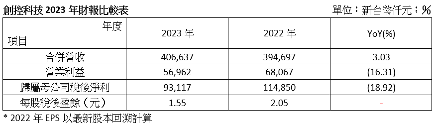創(chuàng)控2023年營收4.07億元,年增3%;稅後淨(jìng)利0.93億元,年減18.92%;每股稅後淨(jìng)利(EPS)1.55元。創(chuàng)控現(xiàn)有指標(biāo)客戶群穩(wěn)定,氣體檢測設(shè)備與後續(xù)的設(shè)備維護(hù)及耗材需求穩(wěn)健,即使去年全球半導(dǎo)體產(chǎn)業(yè)資本支出下滑,創(chuàng)控的營收仍創(chuàng)歷史新高,惟產(chǎn)品組合差異,毛利率微減,且因應(yīng)客戶需求、強(qiáng)化公司產(chǎn)品多元化,研發(fā)費用增加,稅後淨(jìng)利略低於前年表現(xiàn)。今年全球半導(dǎo)體廠設(shè)備支出預(yù)期將回升,創(chuàng)控更加深耕半導(dǎo)體製程控管領(lǐng)域,持續(xù)擴(kuò)張半導(dǎo)體業(yè)務(wù),此外也積極拓展產(chǎn)品應(yīng)用的多元性,將成功經(jīng)驗複製至更多產(chǎn)業(yè)以及環(huán)境業(yè)務(wù),追求公司業(yè)績穩(wěn)定成長。