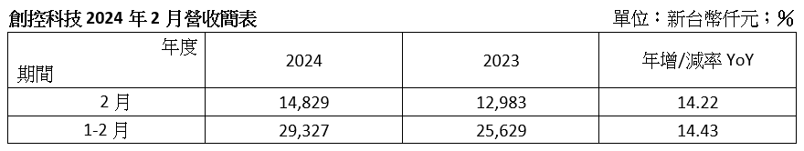 - 持續(xù)擴(kuò)展新客戶與開發(fā)新產(chǎn)品應(yīng)用,強(qiáng)化公司業(yè)績成長動能,2月營收14,829仟元,較去年同期成長14.22%;累計1-2月營收29,327仟元,年增14.43%。