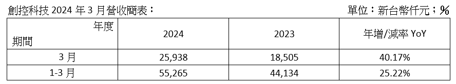 創(chuàng)控科技3月?tīng)I(yíng)收2,594萬(wàn)元 年增40.17% 營(yíng)收連四個(gè)月創(chuàng)同期新高